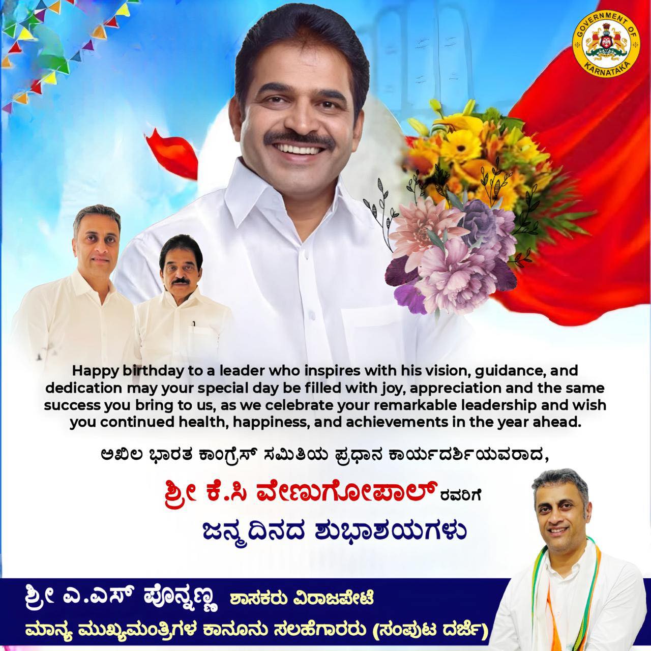 ಅಖಿಲ ಭಾರತ ಕಾಂಗ್ರೆಸ್ ಸಮಿತಿಯ ಪ್ರಧಾನ ಕಾರ್ಯದರ್ಶಿಯವರಾದ, ಶ್ರೀ ಕೆ.ಸಿ ವೇಣುಗೋಪಾಲ್ ರವರಿಗೆ ಜನ್ಮದಿನದ ಶುಭಾಶಯಗಳು.