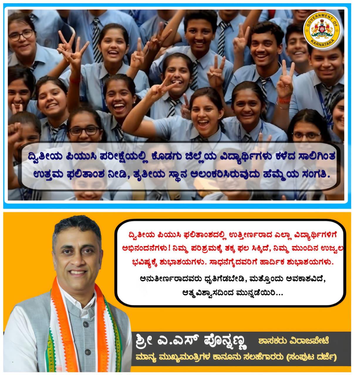ದ್ವಿತೀಯ ಪಿಯುಸಿ ಪರೀಕ್ಷೆಯಲ್ಲಿ ಕೊಡಗು ಜಿಲ್ಲೆಯ ವಿದ್ಯಾರ್ಥಿಗಳು ಕಳೆದ ಸಾಲಿಗಿಂತ ಉತ್ತಮ ಫಲಿತಾಂಶ ನೀಡಿ, ತೃತೀಯ ಸ್ಥಾನ ಅಲಂಕರಿಸಿರುವುದು ಹೆಮ್ಮೆಯ ಸಂಗತಿ.