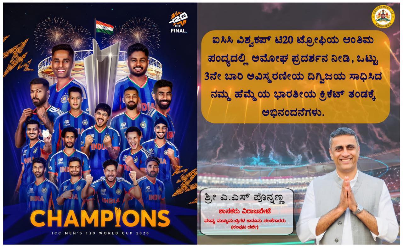 ಐಸಿಸಿ ವಿಶ್ವಕಪ್ ಟಿ20 ಟ್ರೋಫಿಯ ಆಂತಿಮ ಪಂದ್ಯದಲ್ಲಿ ಅಮೋಘ ಪ್ರದರ್ಶನ ನೀಡಿ, ಒಟ್ಟು 3ನೇ ಬಾರಿ ಅವಿಸ್ಮರಣೀಯ ದಿಗ್ವಿಜಯ ಸಾಧಿಸಿದ ನಮ್ಮ ಹೆಮ್ಮೆಯ ಭಾರತೀಯ ಕ್ರಿಕೆಟ್ ತಂಡಕ್ಕೆ ಅಭಿನಂದನೆಗಳು.