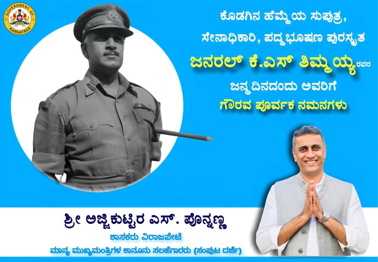 ಕೊಡಗಿನ ಹೆಮ್ಮೆಯ ಸುಪುತ್ರ, ಸೇನಾಧಿಕಾರಿ, ಪದ್ಮಭೂಷಣ ಪುರಸ್ಕೃತ ಜನರಲ್ ಕೆ.ಎಸ್ ತಿಮ್ಮಯ್ಯರವರ ಜನ್ಮದಿನದಂದು ಅವರಿಗೆ ಗೌರವ ಪೂರ್ವಕ ನಮನಗಳು