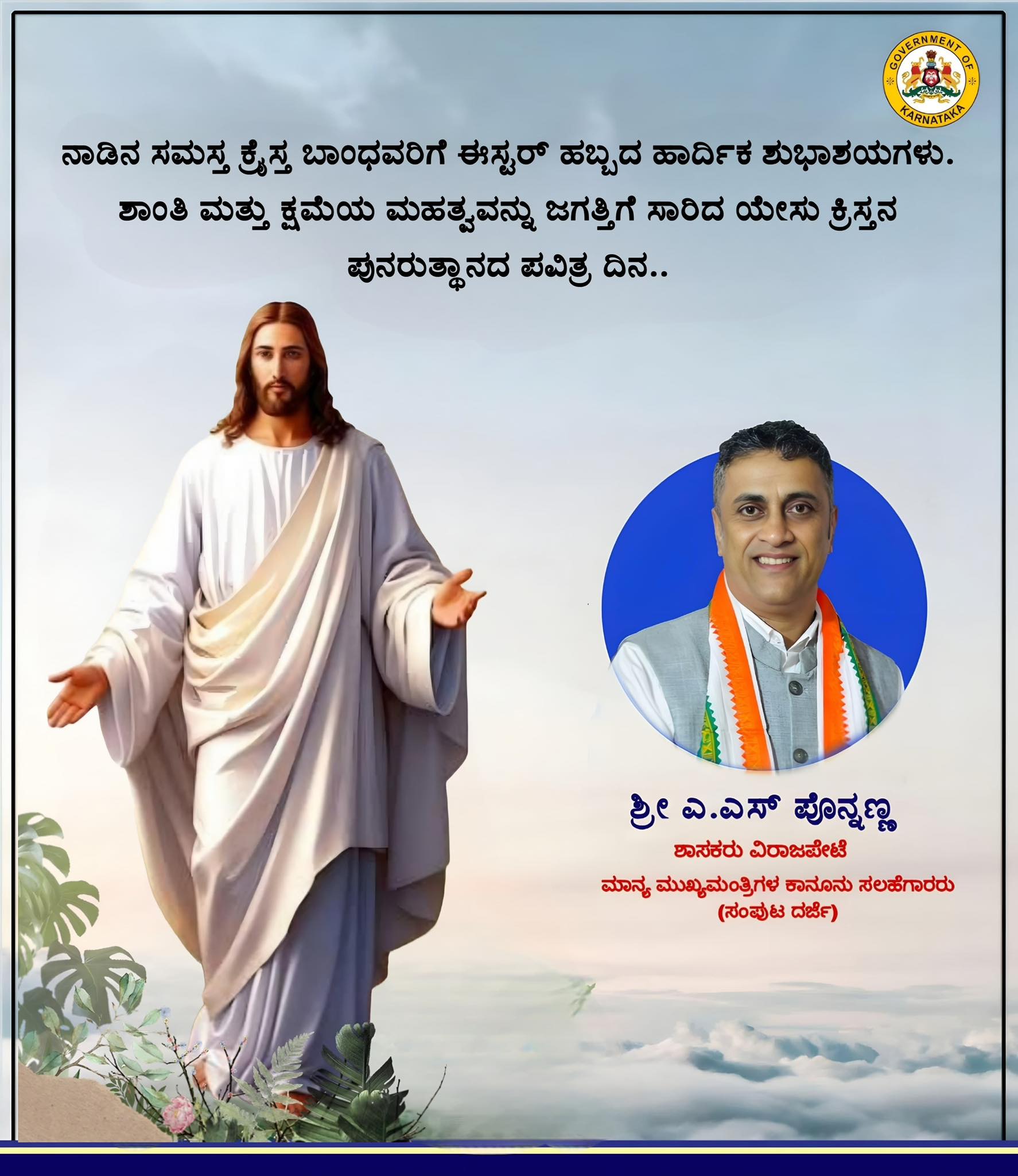 ನಾಡಿನ ಸಮಸ್ತ ಕ್ರೈಸ್ತ ಬಾಂಧವರಿಗೆ ಈಸ್ಟರ್ ಹಬ್ಬದ ಹಾರ್ದಿಕ ಶುಭಾಶಯಗಳು.