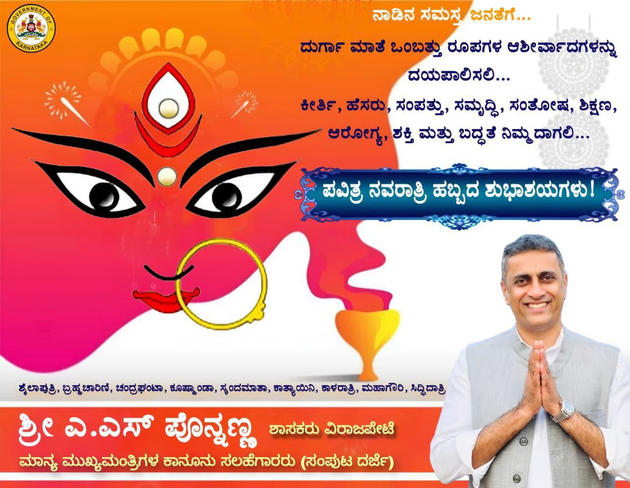 ನಾಡಿನ ಸಮಸ್ತ ಜನತೆಗೆ ದುರ್ಗಾ ಮಾತೆ ಒಂಬತ್ತು ರೂಪಗಳ ಆಶೀರ್ವಾದಗಳನ್ನು ದಯಪಾಲಿಸಲಿ.ಕೀರ್ತಿ, ಹೆಸರು, ಸಂಪತ್ತು, ಸಮೃದ್ಧಿ, ಸಂತೋಷ, ಶಿಕ್ಷಣ, ಆರೋಗ್ಯ, ಶಕ್ತಿ ಮತ್ತು ಬದ್ಧತೆ ನಿಮ್ಮದಾಗಲಿ ಪವಿತ್ರ ನವರಾತ್ರಿ ಹಬ್ಬದ ಶುಭಾಶಯಗಳು.