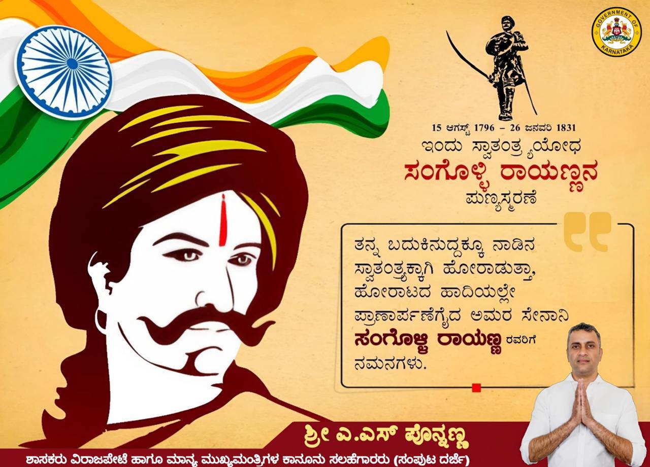 ತನ್ನ ಬದುಕಿನುದ್ದಕ್ಕೂ ನಾಡಿನ ಸ್ವಾತಂತ್ರ್ಯಕ್ಕಾಗಿ ಹೋರಾಡುತ್ತಾ, ಹೋರಾಟದ ಹಾದಿಯಲ್ಲೇ ಪ್ರಾಣಾರ್ಪಣೆಗೈದ ಅಮರ ಸೇನಾನಿ ಸಂಗೊಳ್ಳಿ ರಾಯಣ್ಣ ರವರಿಗೆ ನಮನಗಳು.