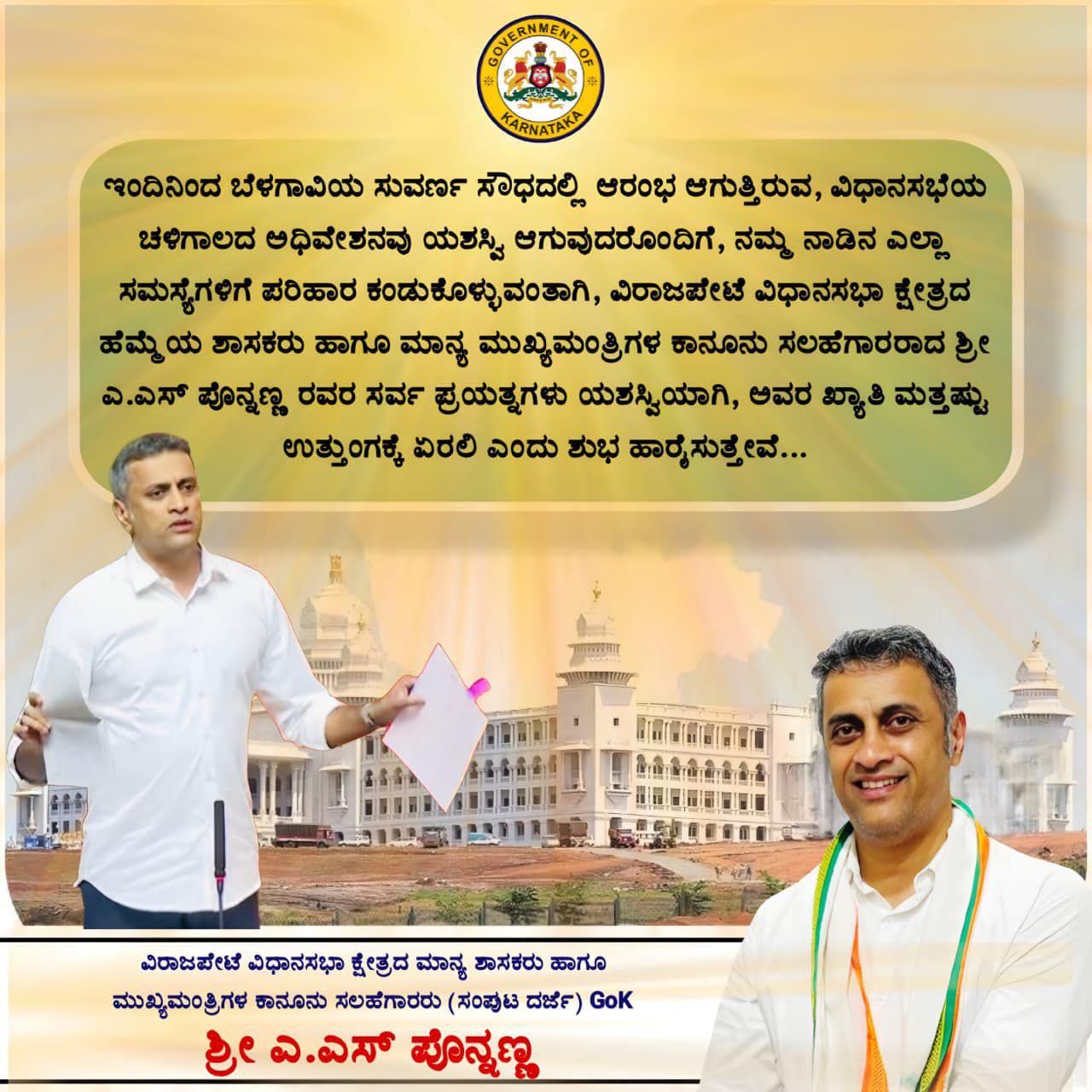 ಇಂದಿನಿಂದ ಆರಂಭವಾಗುವ ಬೆಳಗಾವಿ ಚಳಿಗಾಲ ಅಧಿವೇಶನವು ಯಶಸ್ವಿಯಾಗಿ ನಾಡಿನ ಜನರ ಸಮಸ್ಯೆಗೆ ಪರಿಹಾರ ಸಿಗುವಂತಾಗಲಿ ಎಂದು ಪ್ರಾಥಿಸುತ್ತೇನೆ.