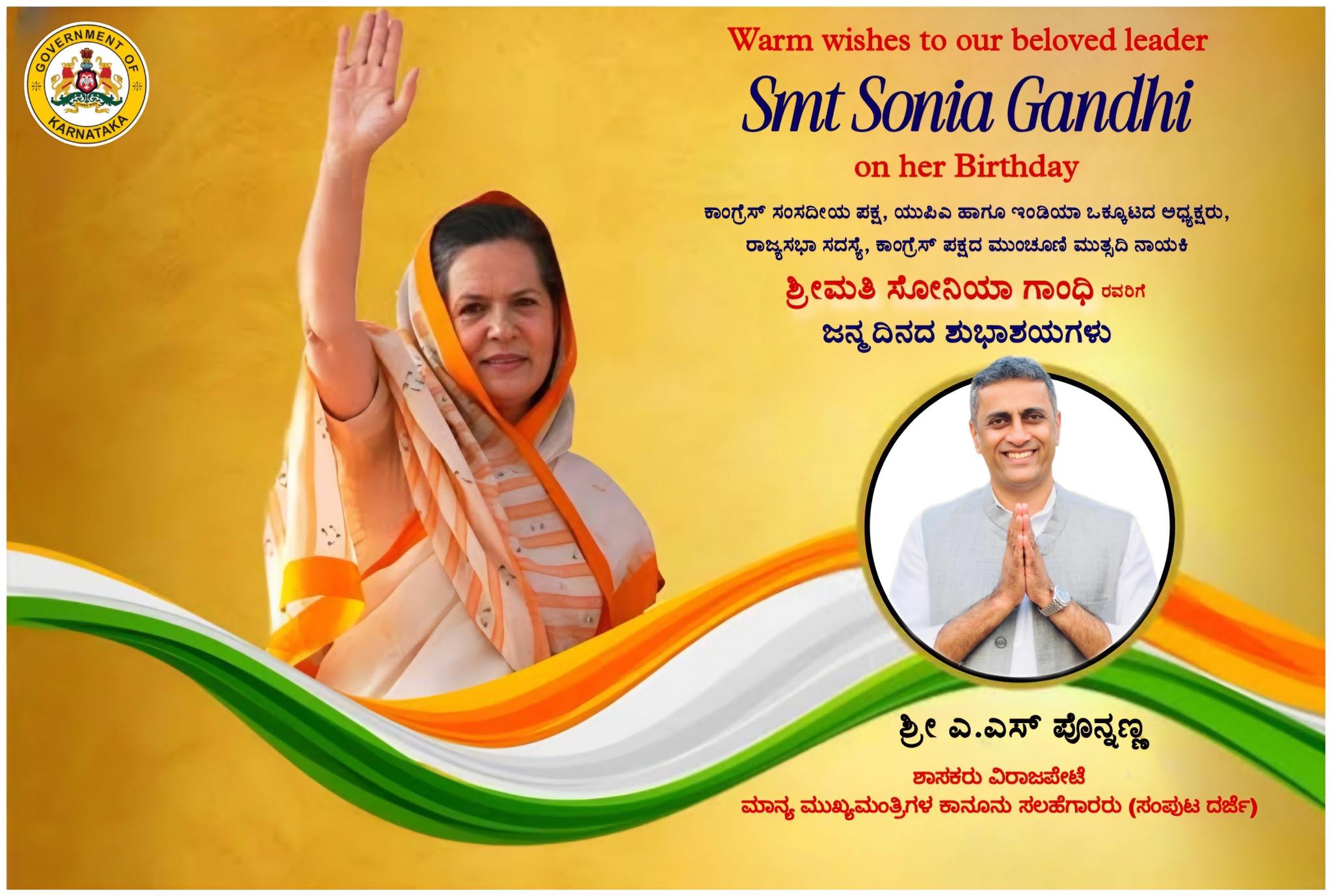 ಕಾಂಗ್ರೆಸ್ ಸಂಸದೀಯ ಪಕ್ಷ, ಯುಪಿಎ ಹಾಗೂ ಇಂಡಿಯಾ ಒಕ್ಕೂಟದ ಅಧ್ಯಕ್ಷರು, ರಾಜ್ಯ ಸಭಾ ಸದಸ್ಯೆ, ಕಾಂಗ್ರೆಸ್ ಪಕ್ಷದ ಮುಂಚೂಣಿ ಮುತ್ಸದಿ ನಾಯಕಿ ಶ್ರೀಮತಿ ಸೋನಿಯಾ ಗಾಂಧಿ ರವರಿಗೆ ಜನ್ಮದಿನದ ಶುಭಾಶಯಗಳು