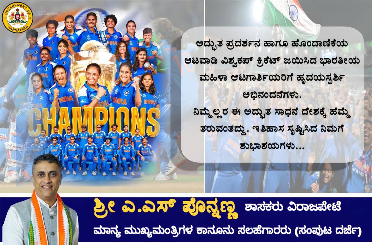 ಅದ್ಭುತ ಪ್ರದರ್ಶನ ಹಾಗೂ ಹೊಂದಾಣಿಕೆಯ ಆಟವಾಡಿ ವಿಶ್ವಕಪ್ ಕ್ರಿಕೆಟ್ ಜಯಿಸಿದ ಭಾರತೀಯ ಮಹಿಳಾ ಆಟಗಾರ್ತಿಯರಿಗೆ ಹೃದಯಸ್ಪರ್ಶಿ ಅಭಿನಂದನೆಗಳು.