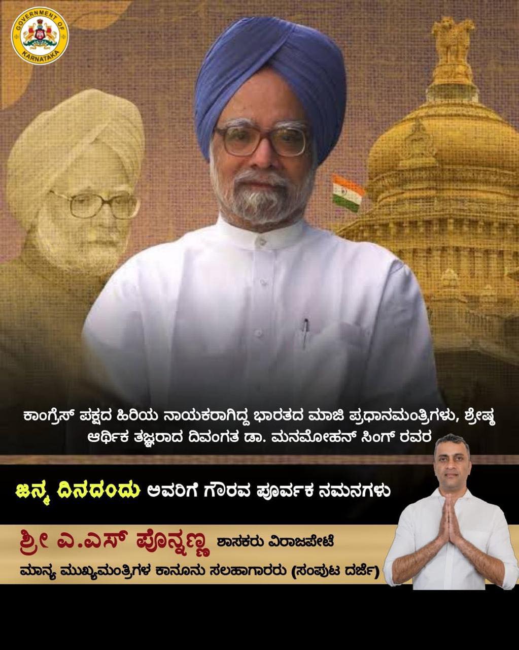 ಕಾಂಗ್ರೆಸ್ ಪಕ್ಷದ ಹಿರಿಯ ನಾಯಕರಾಗಿದ್ದ ಭಾರತದ ಮಾಜಿ ಪ್ರಧಾನಮಂತ್ರಿಗಳು, ಶ್ರೇಷ್ಠ ಆರ್ಥಿಕ ತಜ್ಞರಾದ ದಿವಂಗತ ಡಾ. ಮನಮೋಹನ್ ಸಿಂಗ್ ರವರ ಜನ್ಮ ದಿನದಂದು ಅವರಿಗೆ ಗೌರವ ಪೂರ್ವಕ ನಮನಗಳು.