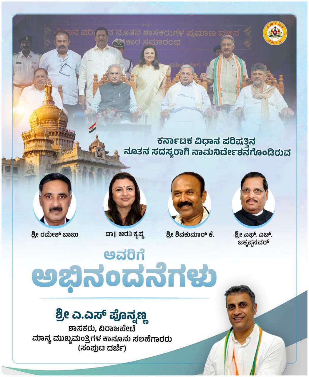 Sri Ramesh Babu, Dr|| Arati Krishna, Sri Shivakumar and Sri F who have been nominated as new members of Karnataka Legislative Council. Congratulations to H. Jakkappanavar., 12/09/2025
