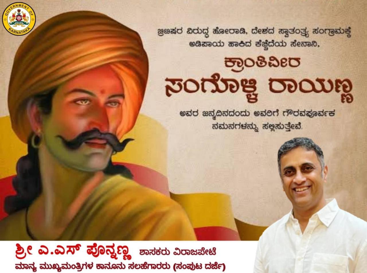 ಬ್ರಿಟಿಷರ ವಿರುದ್ಧ ಹೋರಾಡಿ ದೇಶದ ಸ್ವಾತಂತ್ರ್ಯ ಸಂಗ್ರಾಮಕ್ಕೆ ಅಡಿಪಾಯ ಹಾಕಿದ ಕೆಚ್ಚೆದೆಯ ಸೇನಾನಿ ಕ್ರಾಂತಿವೀರ ಸಂಗೊಳ್ಳಿ ರಾಯಣ್ಣ ಅವರ ಜನ್ಮದಿನದಂದು ಅವರಿಗೆ ಗೌರವಪೂರ್ವಕ ನಮನಗಳನ್ನು ಸಲ್ಲಿಸುತ್ತೇವೆ. .../div>
